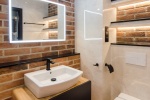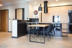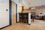 Na podłogach położone kafle, na ścianach nowoczesne tapety i gładzie. W salonie na ścianie dekor z ozdobnej cegły. Kuchnia zabudowana na wymiar i wyposażone w sprzęt AGD (płyta indukcyjna, piekarnik elektryczny, lodówka z zamrażarka, okap kuchenny, zmywarka) W przedpokoju na podłodze kafle. Łazienki wykończone w glazurze, jedna z wanną i opcją prysznica, w drugiej zainstalowana kabina natryskowa z deszczownicą. Zainstalowana pralka.