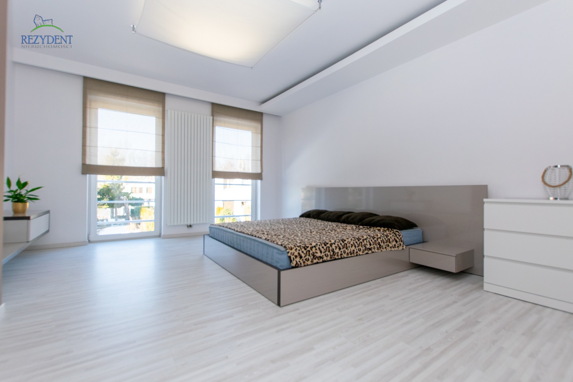– ustawna sypialnia, pięknie oświetlona z balkonami francuskimi