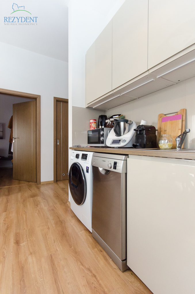 Nowoczesna kuchnia, zabudowana na wymiar, na wyposażeniu lodówka z zamrażalką, pralka, zmywarka, mikrofalówka, płyta elektryczna z piekarnikiem, pochłaniacz, zlew z baterią.